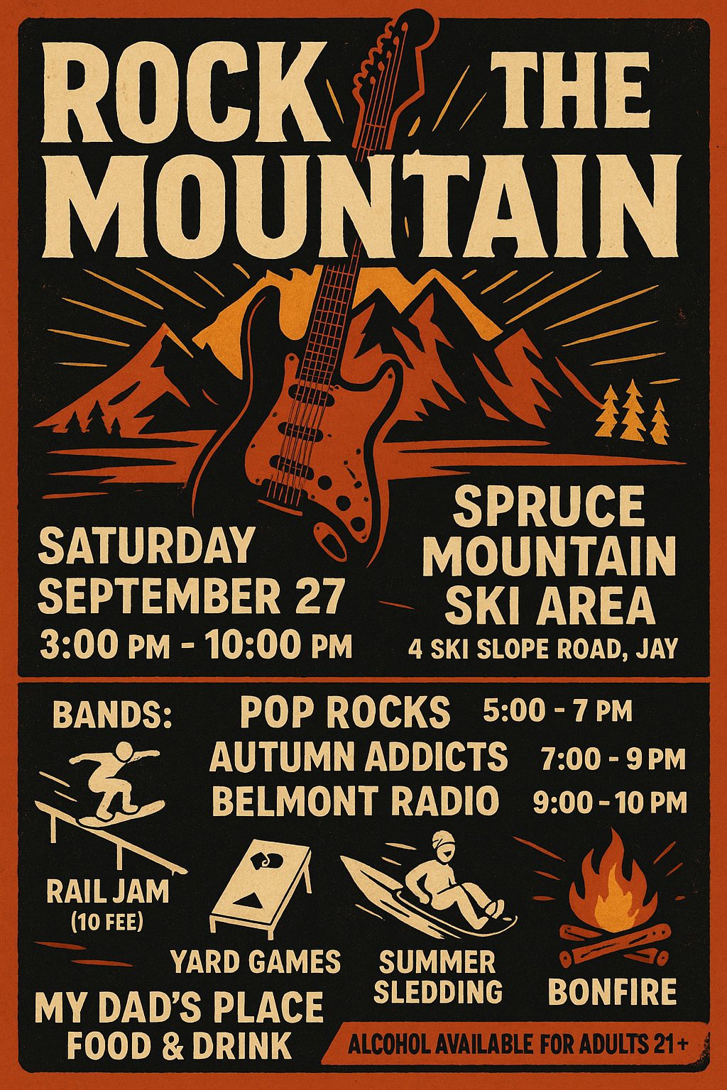 To celebrating recent upgrades and improvements to the Mountain and Lodge from Maine Cabin Masters, Jay Recreation Committee, Spruce Mountain Ski Club and Androscoggin Land Trust is excited to announce the inaugural Rock the Mountain Event. This free community event aims to showcase our collective efforts and thank the community and business leaders like you who have played a vital role in enhancing this valuable outdoor resource. The festivities will start with a little snow in September. The terrain park will come to life after it’s summer slumber with incredible Rail Jam. Some pre-season fun for skiers and boarders to try out their new skills. The celebration will continue with several local live bands, games, community connection and amazing food. We welcome you to get loose at Spruce.